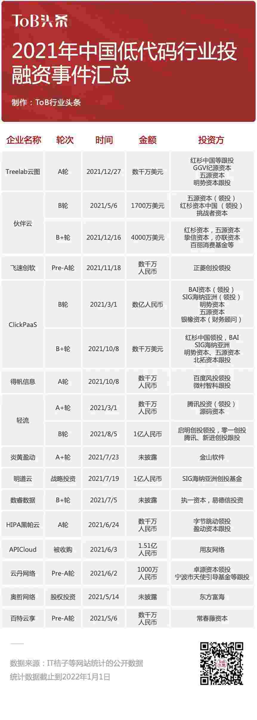 到2021年,,,,无/低代码投融资规模势头更甚,,其中包括轻流两轮融资(A+轮数千万人民币,,,,B轮近亿人民币)、、NO钱包 两轮融资(B轮数亿人民币,,B+轮数千万美元)、、百特云享数千万元Pre-A轮融资......