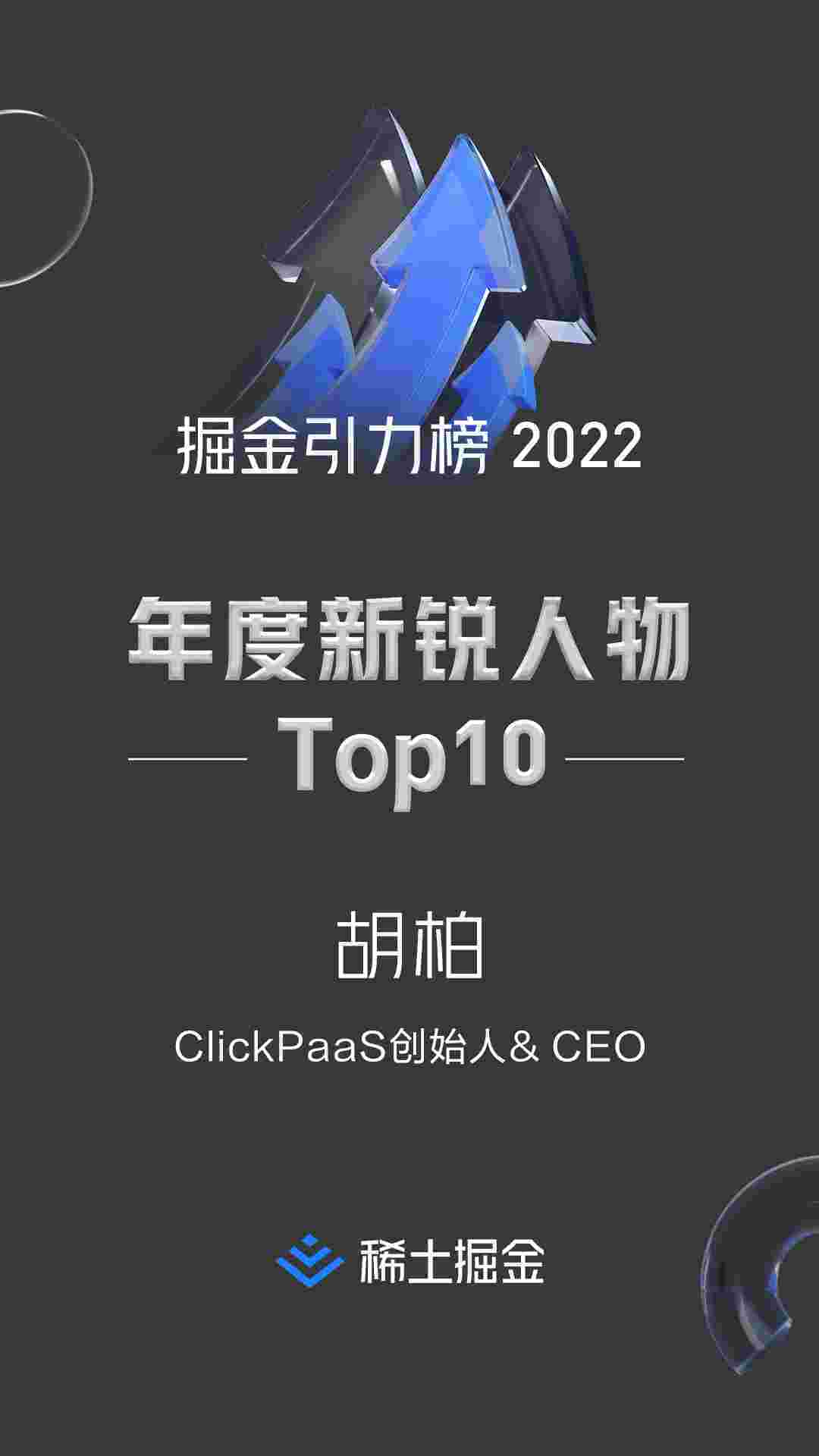 2022年1月6日,,稀土掘金社区第一届「掘金未来大会」成功举办,,,,会上发布了“2022 稀土掘金引力榜 年度新锐人物”榜单,,,,上海爱湃斯科技有限公司(简称NO钱包)创始人及CEO胡柏实力入选年度新锐人物TOP 10。。